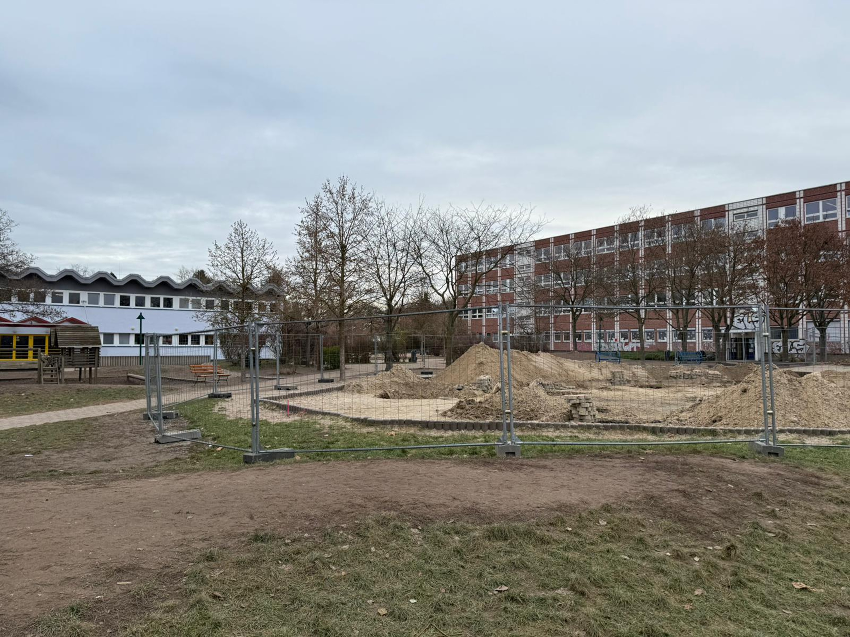 Um die Sandfläche bis zur Umsetzung einer neuen Lösung weiterhin nutzbar zu machen, wurden die bereits ausgehobenen Fundamentlöcher wieder fachgerecht verschlossen und der Bauzaun entfernt. Die Spielfläche kann somit wieder als solche genutzt werden.